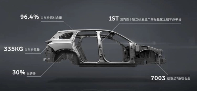 蔚來汽車為國內(nèi)新能源汽車輕量化風(fēng)向標(biāo)。蔚來汽車作為國內(nèi)的新能源汽車明星品牌,加注輕量化,在新能源汽車輕量化領(lǐng)域也取得了一定的成效。蔚來ES8車身運(yùn)用了諾貝麗斯(Novelis)先進(jìn)的汽車鋁合金,全鋁車身比傳統(tǒng)鋼制車身降低了約40%的重量,最終實現(xiàn)白車身重量僅為335kg,車身用鋁率達(dá)到95.8%,為全球最高。